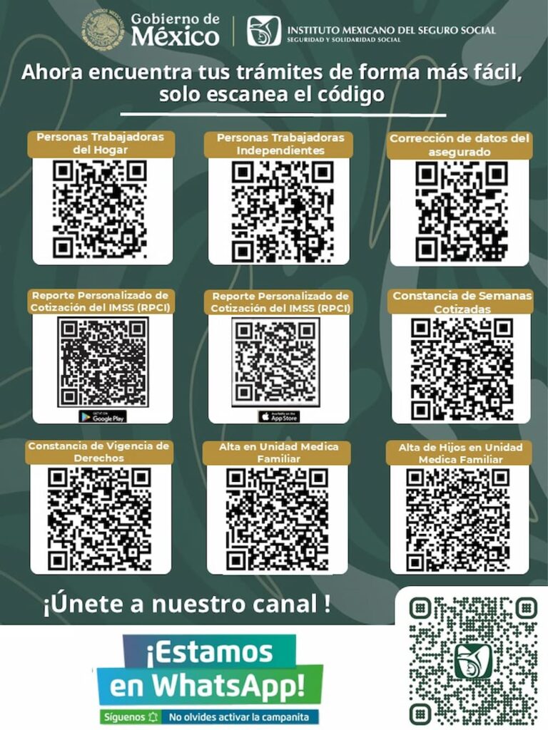 Para facilitar el acceso inmediato, seguro y eficiente a los principales trámites y servicios del Instituto Mexicano del Seguro Social (IMSS) a derechohabientes y patrones sin necesidad de acudir presencialmente a unidades administrativas y médicas, se habilitaron códigos QR que permiten el ingreso directo a través de dispositivos móviles.