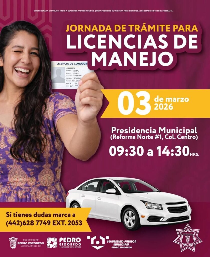 Con el objetivo de facilitar los trámites a la ciudadanía, el municipio de Pedro Escobedo anunció la realización de una Jornada de Trámite para Licencias de Manejo, que se llevará a cabo el próximo 3 de marzo de 2026.
