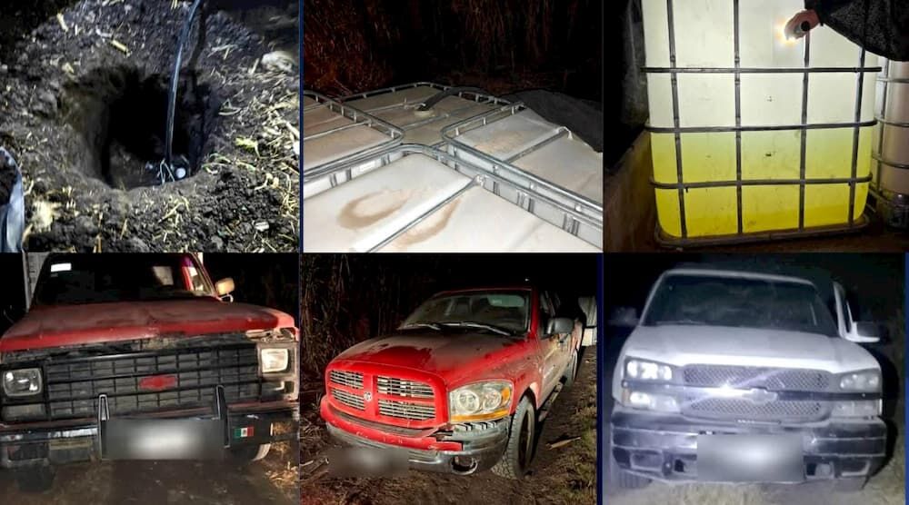 Durante la inspección fueron asegurados 12 bidones con capacidad de mil litros; once de ellos se encontraban vacíos y uno más contenía aproximadamente el 30 por ciento de combustible. Además, se aseguraron tres camionetas presuntamente vinculadas con el hecho.