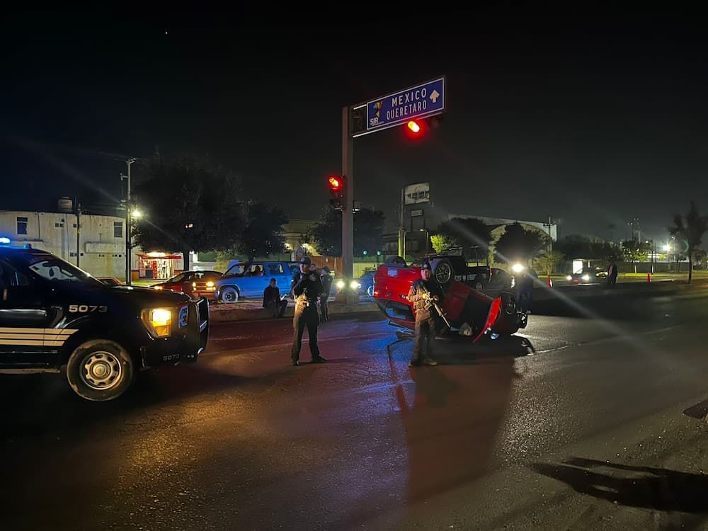 La noche de este sábado, un auto compacto color rojo volcó sobre la avenida Central en la colonia Valle de Oro, al norte de San Juan del Río, luego de que el conductor perdiera el control del vehículo y chocara contra el camellón, quedando con las llantas hacia arriba en el carril de alta velocidad.
