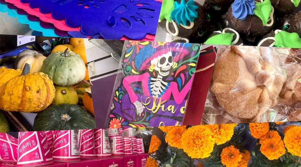 Mientras que en las tiendas de abarrotes meten flores de cempasúchil (puede ser sueltas o en maceta), calabaza de castilla, veladoras, calaveras de azúcar y chocolate, pan de muerto, entre otros artículos.