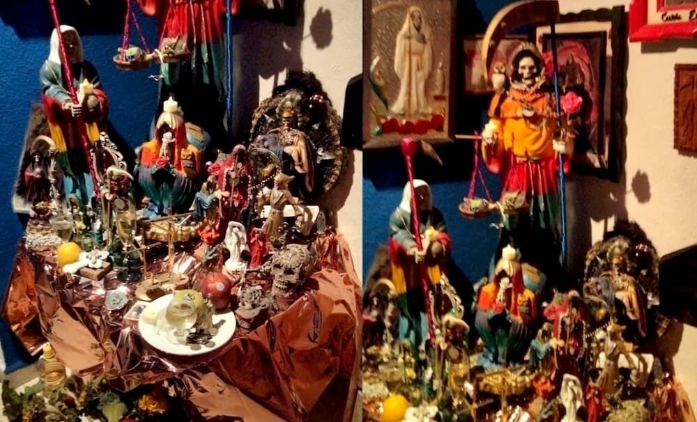 Comentó que le tiene un altar donde le pone manzanas, agua, licor, flores de panteón, cigarros, monedas y velas; también describió que existen figuras de la Santa Muerte de diferentes colores, y el color tiene que ver con lo que se le está pidiendo.