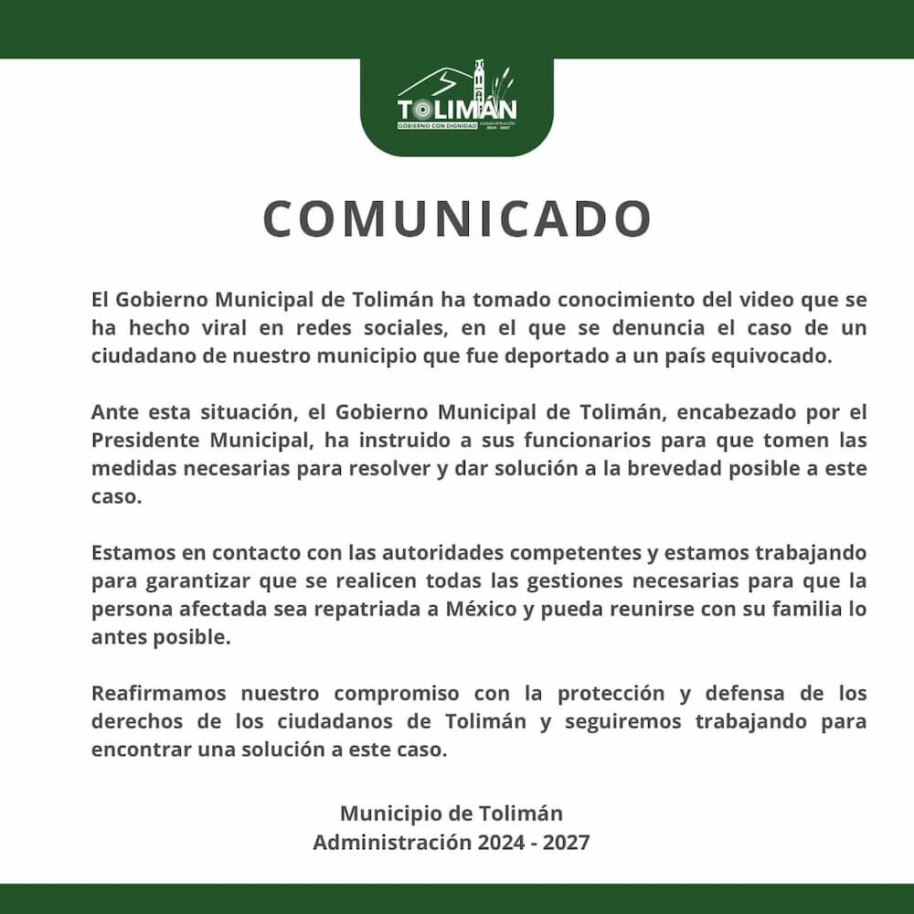 El gobierno municipal de Tolimán informó que intervino en el caso de un ciudadano originario de este municipio que, según un video viral difundido en redes sociales, fue deportado, por error, de Estados Unidos a Guatemala.
