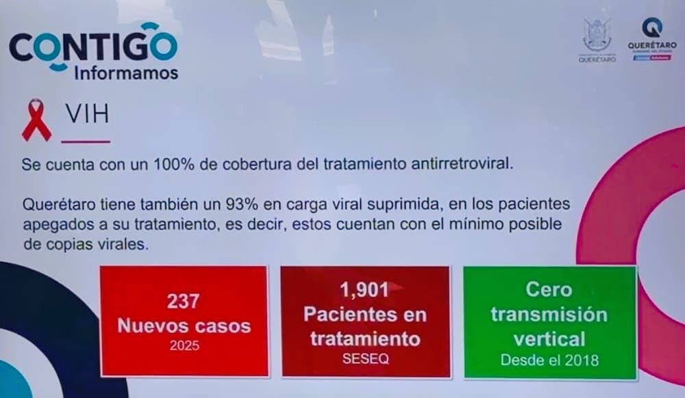 Otro logro relevante, dijo, es que Querétaro reporta cero casos de transmisión vertical, es decir, de madre a hijo durante el embarazo o el parto. Esto ha sido posible gracias a la detección oportuna del virus en mujeres embarazadas y a la aplicación inmediata de tratamientos que evitan que los bebés nazcan con la infección.