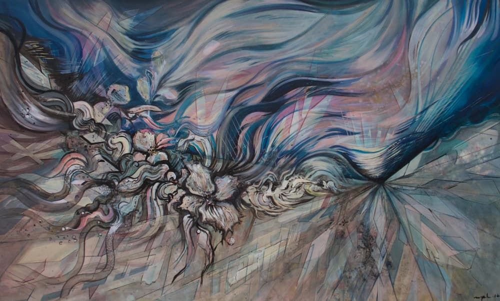 *Las composiciones pictóricas de la autora se enfocan en encontrar los patrones y el orden que interconectan a las plantas, animales, fotones-luz, viento, agua y tierra