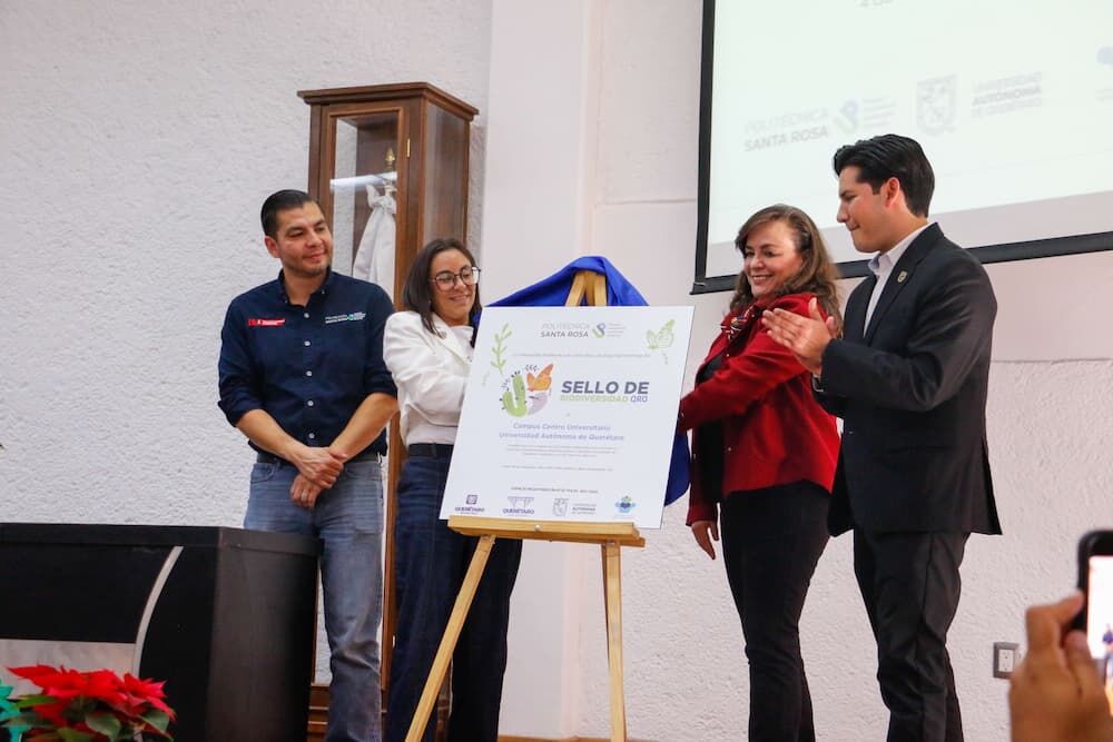 El rector de la Universidad Politécnica de Santa Rosa Jáuregui (UP Santa Rosa), Christian Reyes Méndez, entregó el Sello de Biodiversidad a la rectora de la Universidad Autónoma de Querétaro (UAQ), Silvia Amaya Llano. Este distintivo reconoce a la UAQ por su compromiso en la aplicación de buenas prácticas de sustentabilidad en su campus del Centro Universitario (CU).