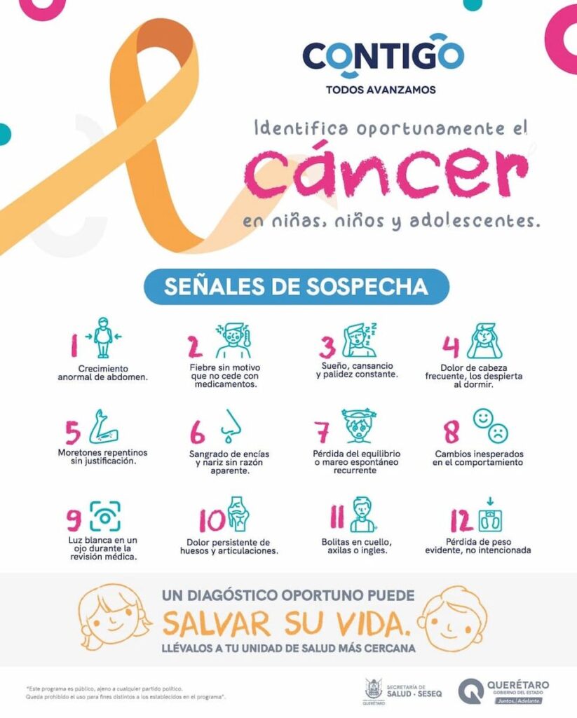 En el estado de Querétaro, el Hospital de Especialidades del Niño y la Mujer “Felipe Núñez Lara” brinda atención y tratamiento a través del equipo multidisciplinario a niñas, niños y a población adolescente que son diagnosticados con cáncer. Para más información acudir al Centro de Salud.