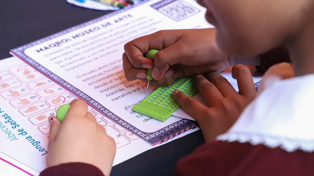 Durante la ceremonia, se realizó un recorrido sensorial en el que participaron niñas y niños con discapacidad, acompañados por sus tutores, así como un taller de escritura en braille. El objetivo fue ofrecer una experiencia que estimule los sentidos y permita conocer el arte desde distintas perspectivas.