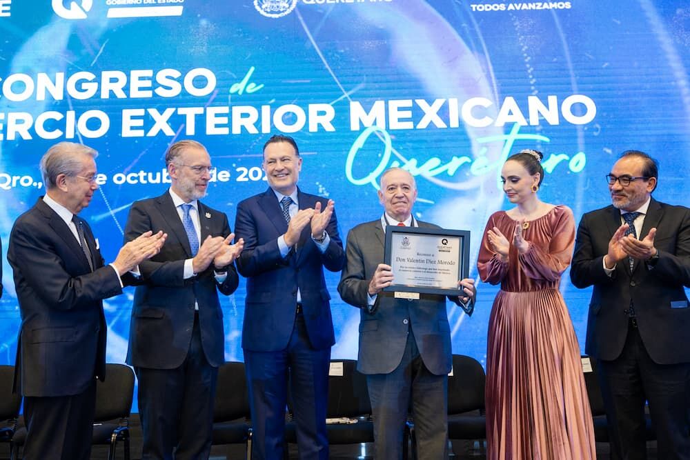 El presidente honorario del COMCE, Valentín Díez Morodo, quien recibió un reconocimiento por su trayectoria y esfuerzos en beneficio del país, compartió que este año el Congreso dedica un espacio muy especial al encuentro de negocios Hecho en México con Calidad, para reconocer la contribución e impulsar nuevas oportunidades de desarrollo internacional. En este tenor, afirmó que Querétaro ofrece el marco ideal para reflexionar sobre esta nueva etapa del comercio internacional.