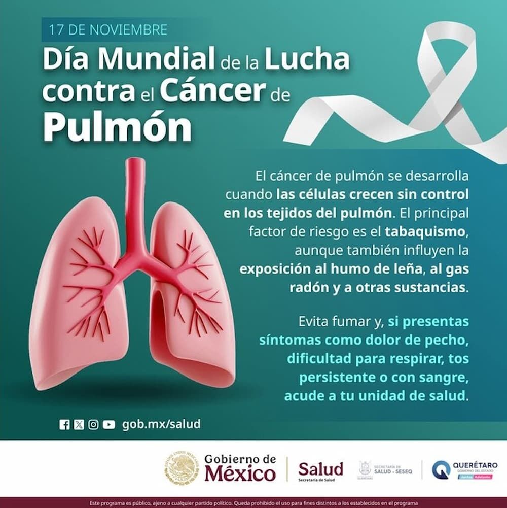 La Secretaría de Salud (SESA) del estado de Querétaro se suma a la conmemoración del Día Mundial de la Lucha contra el Cáncer de Pulmón, que se lleva a cabo cada 17 de noviembre, con el objetivo de sensibilizar a la población sobre este padecimiento y sus complicaciones. En este contexto, la dependencia enfatiza la importancia de adoptar estilos de vida saludables para reducir su incidencia y mortalidad.
