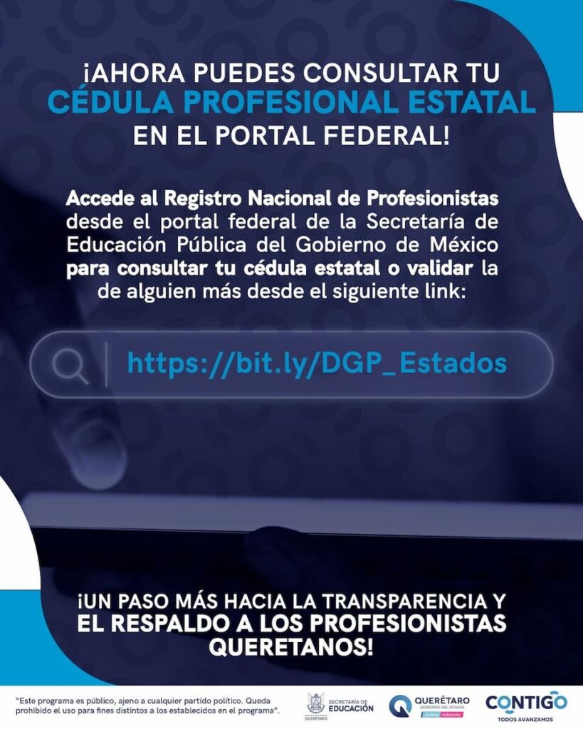 Para consultar este documento en línea puede ingresarse a alguno de los siguientes links: https://bit.ly/DGP_Estados, o  https://cedulaprofesional.sep.gob.mx/cedula-profesional/Cedulas-Estatales; una vez en el portal, deberán seleccionar la entidad federativa donde se originó el documento e ingresar el número de identificación de Cédula. Actualmente, Querétaro forma parte de los siete Estados integrados al Registro Nacional junto con Aguascalientes, Chihuahua, Coahuila, Hidalgo, Michoacán y Sonora.