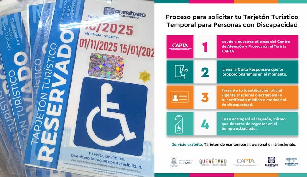 La Secretaría de Turismo del estado de Querétaro a través del Centro de Atención y Protección al Turista (CAPTA) pondrá a disposición de visitantes y turistas el préstamo temporal de tarjetones de estacionamiento para personas con discapacidad, los cuales serán válidos en todo el estado durante su estancia; así lo anunció Juliette Rojo Hernández, coordinadora de este organismo.