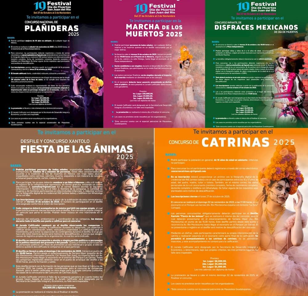 El “Concurso Nacional de Plañideras 2025” forma parte del 19º Festival de Día de Muertos San Juan del Río, mismo que contempla, del mismo modo, la realización de la “Marcha de los Muertos”, a desarrollarse el viernes 31 de octubre a las 19 horas en el Puente de la Historia, para concluir en Plaza Independencia. En este evento podrán participar personas de todas las edades con un disfraz relativo al Día de Muertos; durante la marcha, 15 concursantes serán elegidos con un distintivo y participarán en una pasarela. El primer lugar será acreedor a 10 mil pesos, el segundo a 7 mil y el tercero a 5 mil pesos.