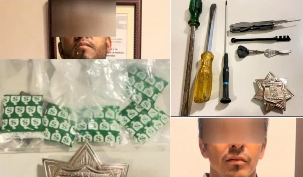 Entre sus pertenencias se localizaron varias bolsas tipo ziploc y bolsas transparentes anudadas que contenían una sustancia blanca granulada con características de narcótico, así como desarmadores, llaves y una herramienta para cortar cristal con la leyenda “Truper”.