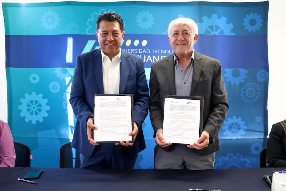 El rector de la Universidad Tecnológica de San Juan del Río (UT San Juan), Fernando Ferrusca Ortiz, y el presidente del Clúster de Tecnologías Digitales, Miguel Ángel Carapia González, firmaron un convenio que contribuirá en la formación de profesionistas que respondan a las necesidades de la industria tecnológica y que fortalezcan el ecosistema digital del estado.