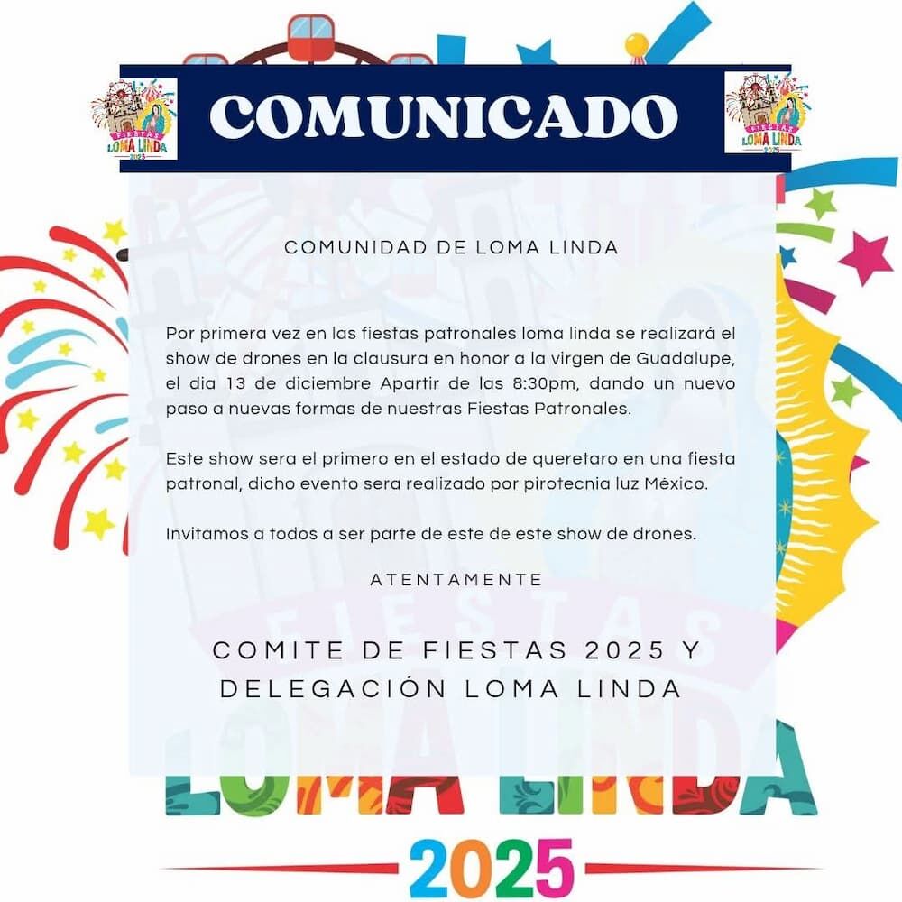 De acuerdo con el Comité de Fiestas 2025 y la Delegación de Loma Linda, este será el primer show de drones que se realiza en una fiesta patronal dentro del estado de Querétaro, marcando un precedente en la forma de celebrar las tradiciones religiosas y culturales de la región.