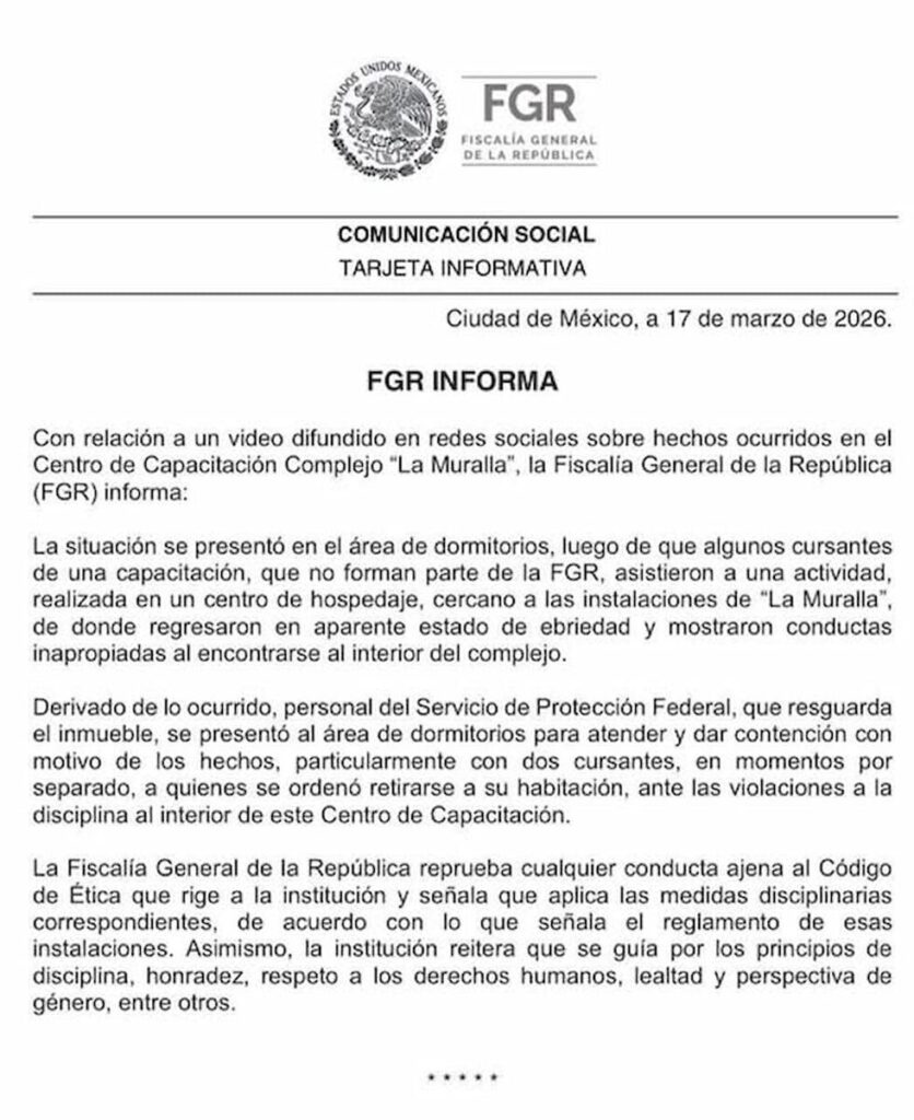 La FGR subrayó que reprueba cualquier conducta que contravenga su Código de Ética y precisó que se aplicarán las medidas disciplinarias correspondientes conforme a la normativa que rige dichas instalaciones.
